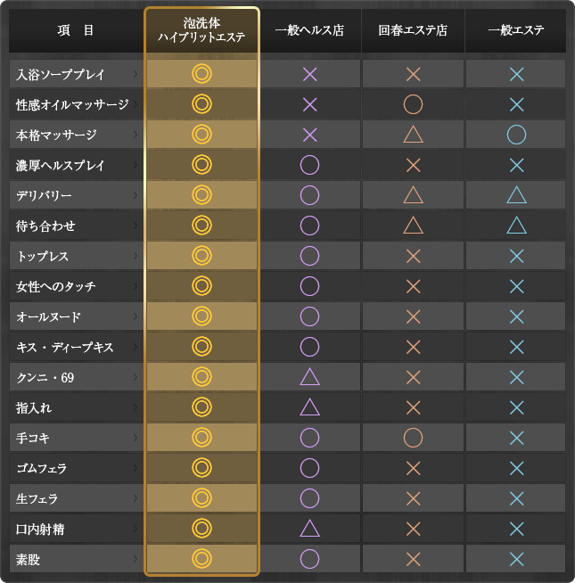 難波泡洗体では、「ヘルス店」「風俗エステ店」「ソープ店」の全てのサービスを兼ね揃えた『ハイブリットエステ』として